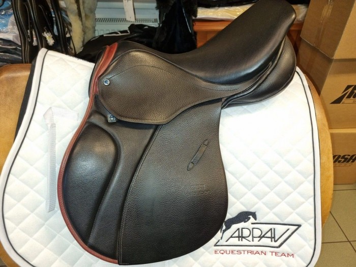 Eleganckie i kompaktowe siodło skokowe z głębokim siedziskiem, wykonane z wysokiej jakości licowej skóry bydlęcej.